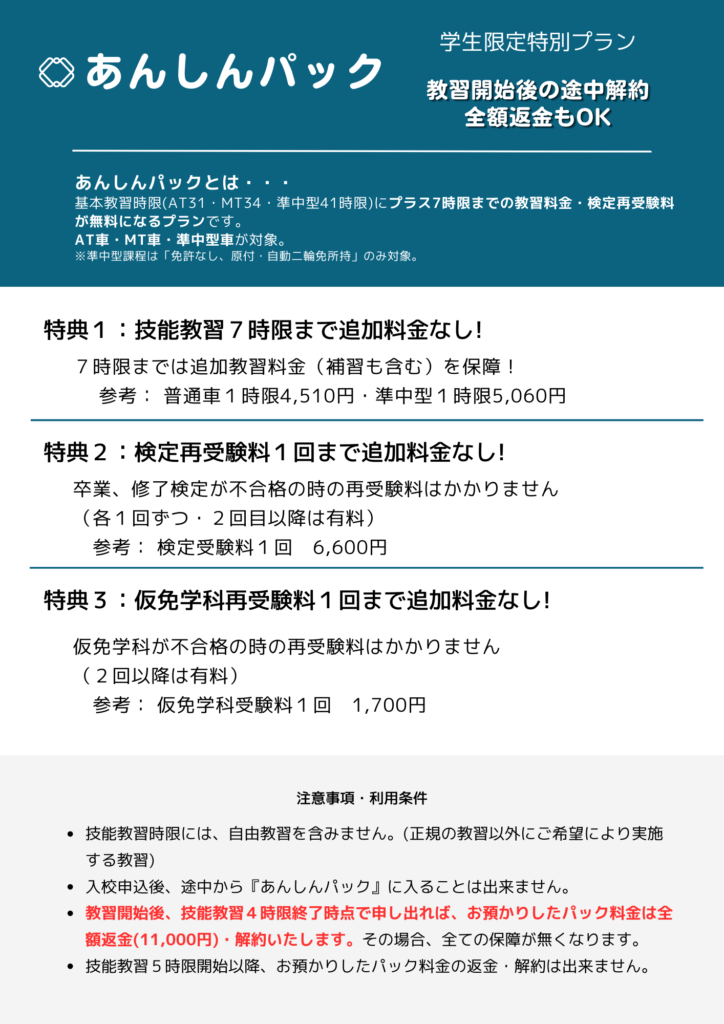 教習オーバーや不合格が心配という方は、技能教習7時間保障、検定再受検料1回保障、仮免学科再受検料1回保障のあんしんパックがおすすめです。教習開始後に、やっぱり必要ない、という方は、途中解約・全額返金も可能です。教習開始後、技能教習4時限終了時点で申し出れば、お預かりしたパック料金は全額返金(11,000円)・解約いたします。