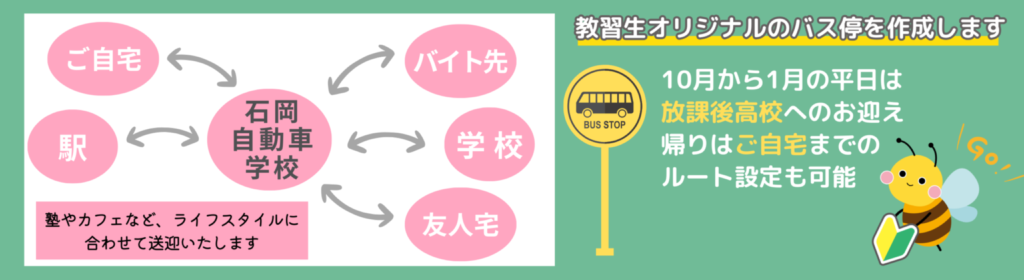 ご自宅や学校、バイト先や職場までの無料送迎付きです。